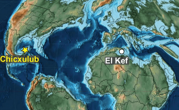 El impacto del asteroide que acabó con los dinosaurios, generó un cráter en Chicxulub, Yucatán, México. Los cambios que se generaron fueron muy rápidos y difíciles de ver en el registro geológico, por ejemplo, el polvo y humo en suspensión cubrieron la atmósfera terrestre, lo cual provocó un invierno con un descenso de temperatura de dos a cuatro grados. Cuando la atmósfera se limpió, la situación se revirtió.